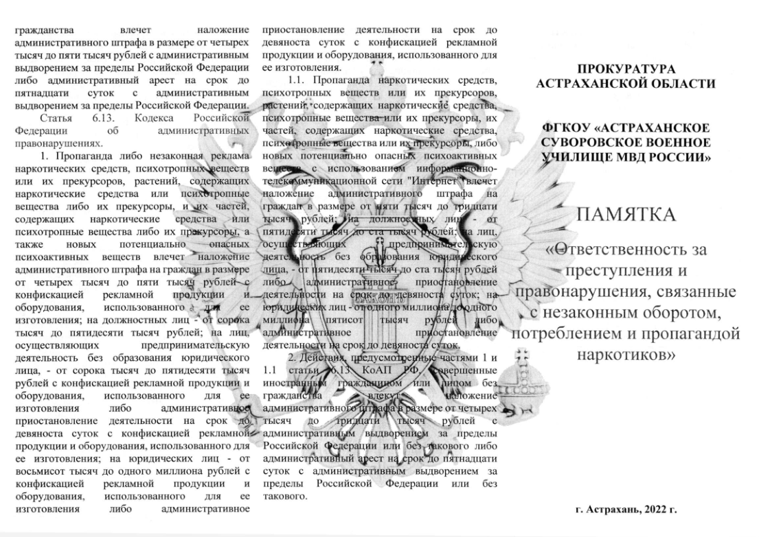 Прокуратура Астраханской области информирует по теме: «Ответственность за преступления и правонарушения, связанные с незаконным оборотом, потреблением и пропагандой наркотиков». Информация разработана совместно с ФГКОУ «Астраханское суворовское военное училище МВД России».